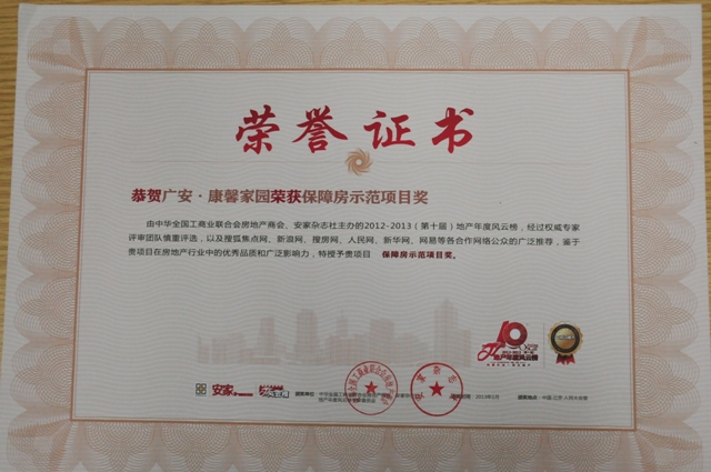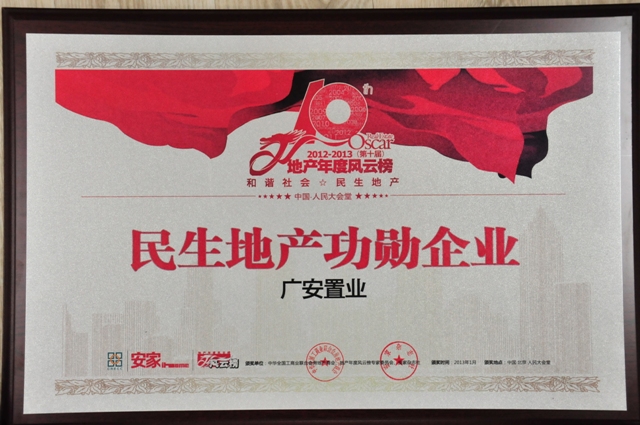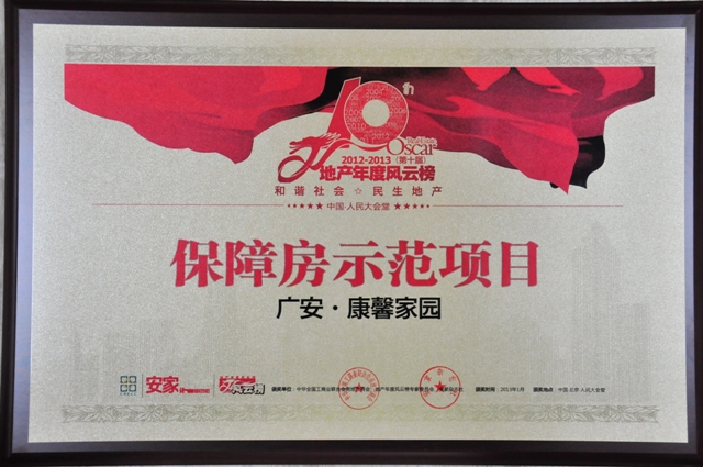 2013年1月18日,從全國工商聯(lián)房地產(chǎn)商會主辦的中國房地產(chǎn)業(yè)“2012-2013地產(chǎn)年度風云榜”頒獎盛會上傳來喜訊,北京廣安置業(yè)投資公司及廣安·康馨家園項目雙雙入選“2012-2013(第十屆)地產(chǎn)年度風云榜”,置業(yè)公司喜獲2012-2013“民生地產(chǎn)功勛企業(yè)”、廣安·康馨家園項目獲得2012-2013“保障房示范項目”榮譽稱號,這是置業(yè)公司在2012年度所獲得的又一大獎,也是對公司及全體員工一年來的辛勤工作的肯定和鼓舞。此次盛會已經(jīng)引起了國內(nèi)房地產(chǎn)行業(yè)眾多公司及知名行業(yè)人士的關(guān)注和參與,全國300多家媒體對此次盛會進行了跟蹤報道。