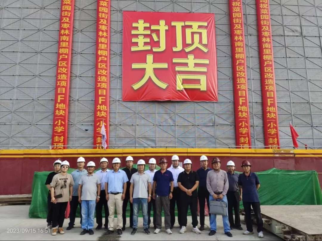 2023年7月13日,經(jīng)廣安集團黨委批準,菜園街項目成立了“菜園街棚改項目臨時黨支部”,臨時黨支部成立了“青年突擊隊”,圍繞菜園街項目中心工作充分發(fā)揮戰(zhàn)斗堡壘和先鋒模范作用,為推動項目建設(shè)提速增效凝聚起了強大合力。同時,為積極落實西城區(qū)學位保障專班工作要求,在西城區(qū)各委辦局的指導下,廣安融盛公司成立了F地塊專項協(xié)調(diào)小組,廣安融盛公司總經(jīng)理擔任組長,施工單位、監(jiān)理單位領(lǐng)導現(xiàn)場辦公,協(xié)調(diào)解決現(xiàn)場疑難問題,為項目快速推進提供了重大保障。結(jié)構(gòu)封頂這一階段性成果,離不開各參建單位的辛勤付出、精誠配合以及各級領(lǐng)導的大力支持與幫助。至此,第一階段施工任務(wù)圓滿完成,為下一階段施工打下了良好的基礎(chǔ),也為項目按時竣工提供了有力保障。