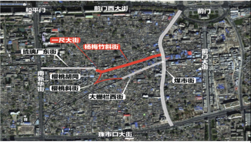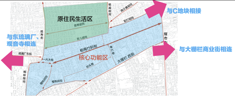項目位于大柵欄地區(qū)煤市街以西,包括原住民生活區(qū)及楊梅竹核心功能區(qū);項目占地面積約8.8公頃,現(xiàn)狀1711戶,單位70個,現(xiàn)狀建筑面積75920平方米,是實現(xiàn)大柵欄及東琉璃廠貫通的重要區(qū)域。