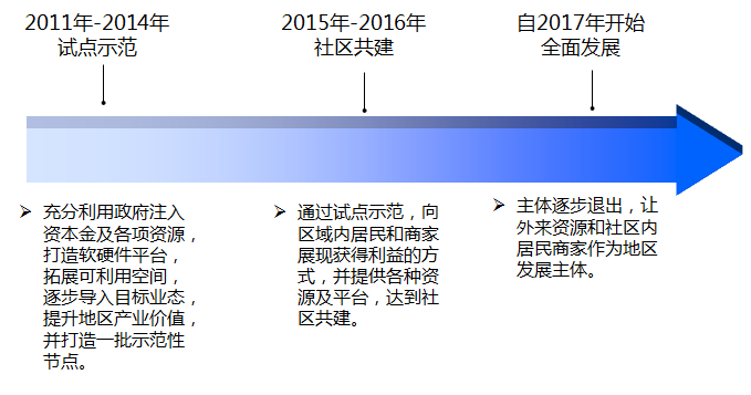 項目實施推進(jìn)的三個階段:從試點示范,帶動社區(qū)共建,帶動社會主體共同參與,最終實現(xiàn)區(qū)域全面發(fā)展。