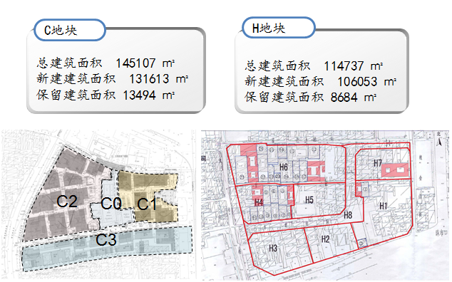 項(xiàng)目由C、H兩個(gè)地塊組成,東至珠寶市糧食店街,西至煤市街,項(xiàng)目通過一二級(jí)聯(lián)動(dòng)方式實(shí)施改造。