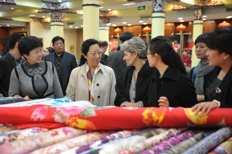 伊琳娜·博科娃參觀了楊梅竹斜街,對大柵欄更新計(jì)劃這一模式給予了充分肯定。隨后,伊琳娜·博科娃游覽了大柵欄商業(yè)街,她高度評價(jià)了古老而繁華的街區(qū)、老字號(hào)的精良工藝,并進(jìn)入內(nèi)聯(lián)升和瑞蚨祥參觀。