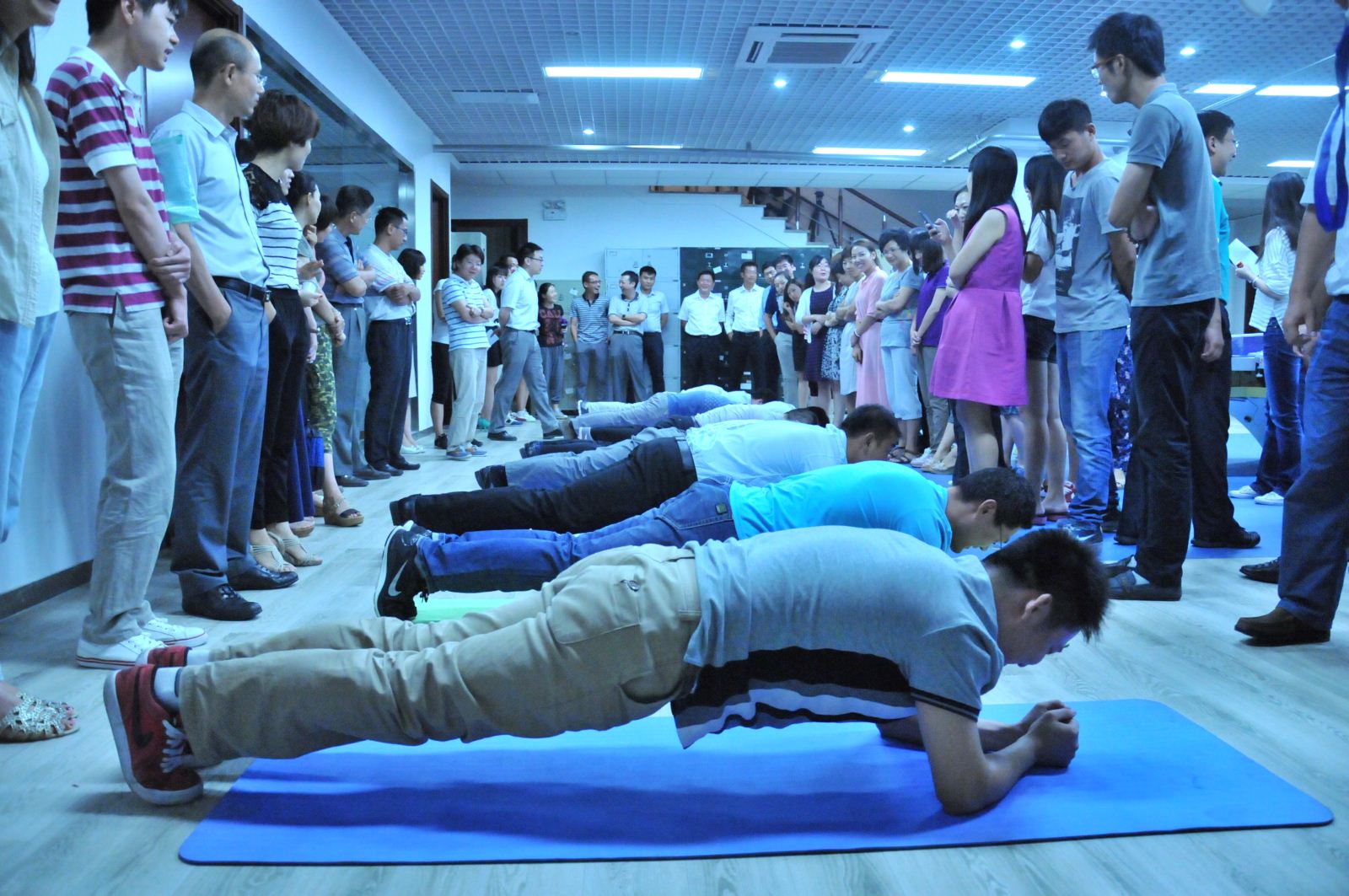 2014年8月廣安置業(yè)利用午休時(shí)間舉行了PLANK平板大賽。經(jīng)過7、8兩日的淘汰賽,堅(jiān)持時(shí)間在2分30秒以上的員工有35人。