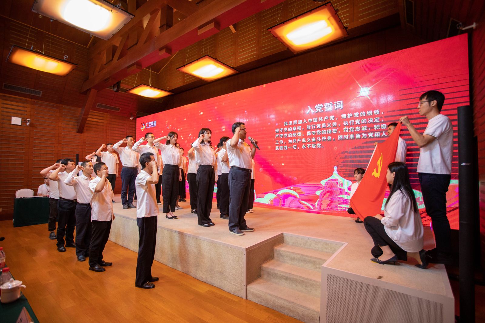 在集團(tuán)黨委書記、董事長易勇同志的帶領(lǐng)下,預(yù)備黨員面向黨旗鄭重宣誓,18名老黨員代表上臺,與臺下黨員同志們共同重溫入黨誓詞。宣誓后,預(yù)備黨員賈菲、宮禹暄、司瑀和姚軍林向大會鄭重表態(tài),在今后的工作和學(xué)習(xí)中,自覺用共產(chǎn)黨員的標(biāo)準(zhǔn)嚴(yán)格要求自己,更加勤奮盡責(zé),無愧于共產(chǎn)黨員光榮稱號。