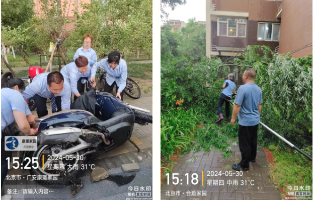 強降雨大風(fēng)來臨后,天寶物業(yè)公司又積極組織各項目部職工頂風(fēng)冒雨加大公區(qū)、中控機房的巡視力度和頻次,對突發(fā)的樹木倒塌、低洼點位積水等情況派專人查看并在現(xiàn)場值守,提醒居民注意安全,同時立即協(xié)調(diào)配合電力、園林、市政等有關(guān)部門對倒塌的樹木、低洼點位積水進行清理,確保居民生命財產(chǎn)安全。